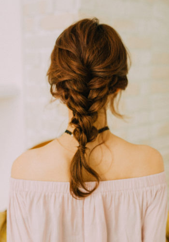 耳あたりからざっくり編み込み、両サイドから三つ編みを作り中央で合わせたローテールアレンジ。