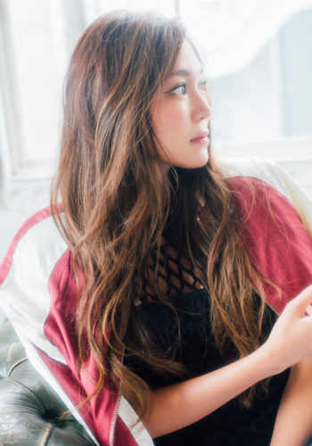 毛先軽めのロングレイヤースタイル。大きめにくせ毛風のカールをつけてスタイリングをしています。かきあげバングと全体のドライな質感がカジュアルで決めすぎないラフな印象をあたえてくれます。